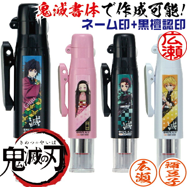 | 特徴 | 「鬼滅の刃」の各キャラクターがプリントされた、ネーム印(9ミリ)と黒檀認印(10ミリ・朱肉が必要)のキャップレスツインネーム印です。 ストラップホール、可動式クリップがついていますので、持ち運びにも便利です。 アニメ・鬼滅の刃で採用された毛筆書体でも9ミリネーム印を作ることができます! 黒檀(こくたん)認印は朱肉をつけて捺すはんこですので、シャチハタが使用できない契約書や重要書類にもなつ印できます。 認定済みの公式グッズです。 |