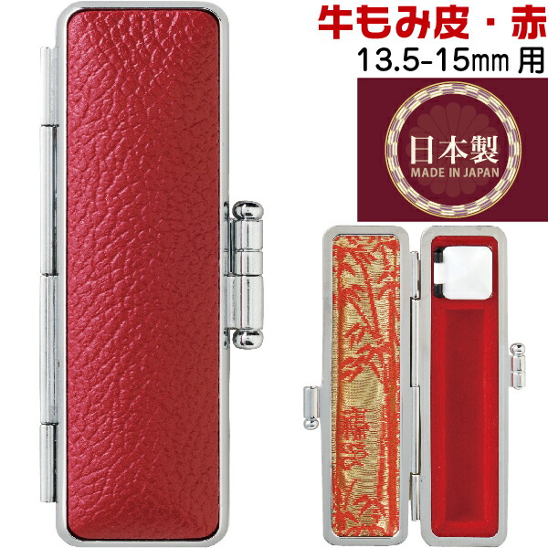大き目の認印や銀行印、小さめの実印のサイズ、13.5〜15ミリ用の高級牛もみ皮製ケース(赤)です。
