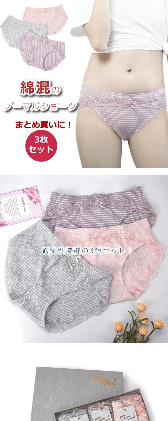 レディースショーツ ショーツ レディース 綿混 3枚セット 下着 デイリー インナー 女性 パンツ パンティー パンティ インナーショーツ レース 刺繍 ボーダー スダンダード コットン 単品 ぱんつ 可愛い かわいい おしゃれ デザイン シンプル プレゼント ギフト 3枚組 可愛いショーツ かわいい下着 スダンダードショーツ ノーマルショーツ レギュラーショーツ バックレース 通気性 きれいめ 3色 グレー ピンク アプリコット お買い得 おすすめ 人気