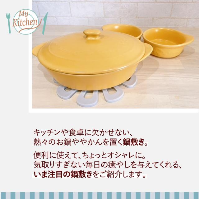 | 商品の説明 | グラタンやお鍋を作ってみたり。 かわいい鍋敷きであっというまにおしゃれお料理に早変わり。 食卓を彩る、シンプルでおしゃれなフラワーモチーフ。 引っ掛けて吊るしたり、つかわないときはどこにだってしまえるので 場所を取りません。 インテリアとしても優秀なので、長くお使いいただけます。 つるつる滑らない、しっかり支える機能だから鍋以外にも ガラス製品の花瓶やオブジェなどの下に敷くのにもおすすめ。 床材の傷防止としてもお使いいただけます。 「軽い」 「熱に強い」 「洗いやすい」 「滑らない」 鍋敷きとして最適な優秀機能を備えた、見た目もかわいいおしゃれな鍋敷き。 大切な人への贈り物としてもぴったりなフラワーモチーフ鍋敷きをぜひお手にとってみてください。 ※熱したフライパンや鍋の素材によっては、200度以上の高温となり加熱直後のご使用は、溶けてしまう場合がございます。 少し冷ましご利用するか耐熱温度内で必ず使用してください。 ・注意:鉄類、土鍋、揚げ物鍋等は特に高温になりますのでご使用しないでください! |