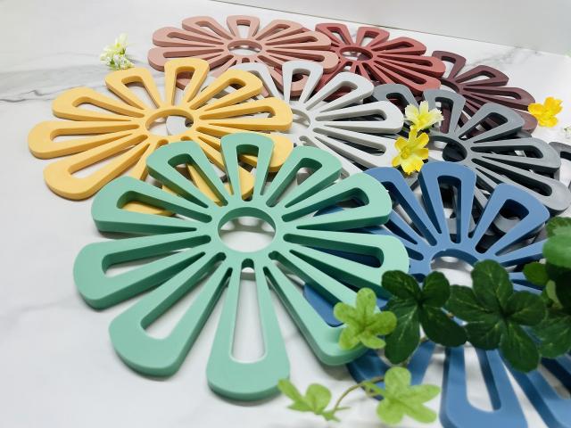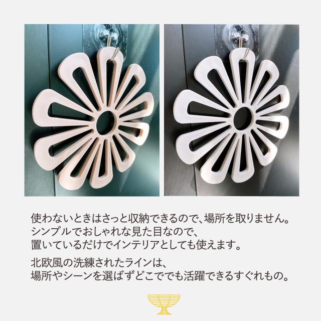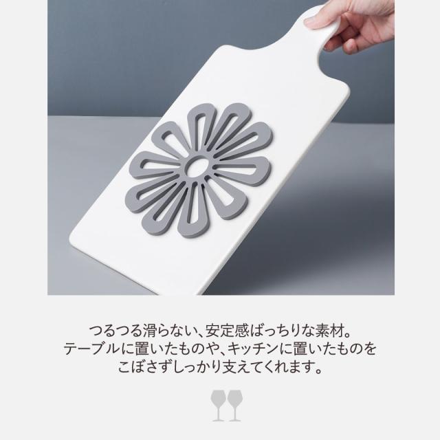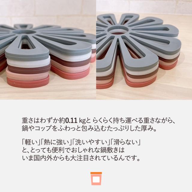 グラタンやお鍋を作ってみたり。かわいい鍋敷きであっというまにおしゃれお料理に早変わり。食卓を彩る、シンプルでおしゃれなフラワーモチーフ。引っ掛けて吊るしたり、つかわないときはどこにだってしまえるので場所を取りません。インテリアとしても優秀なので、長くお使いいただけます。つるつる滑らない、しっかり支える機能だから鍋以外にもガラス製品の花瓶やオブジェなどの下に敷くのにもおすすめ。床材の傷防止としてもお使いいただけます。「軽い」「熱に強い」「洗いやすい」「滑らない」鍋敷きとして最適な優秀機能を備えた、見た目もかわいいおしゃれな鍋敷き。大切な人への贈り物としてもぴったりなフラワーモチーフ鍋敷きをぜひお手にとってみてください。※熱したフライパンや鍋の素材によっては、200度以上の高温となり加熱直後のご使用は、溶けてしまう場合がございます。