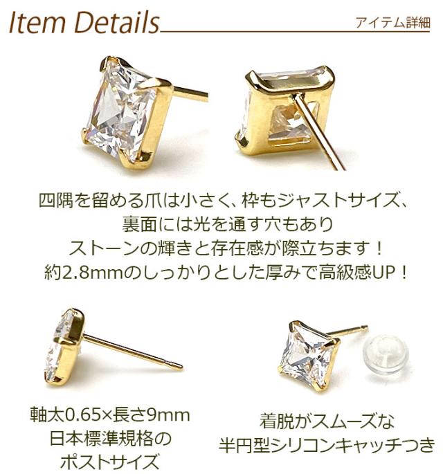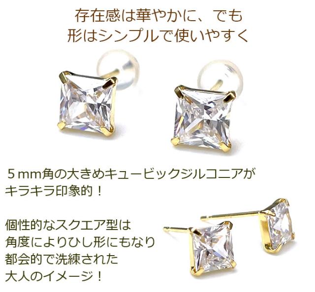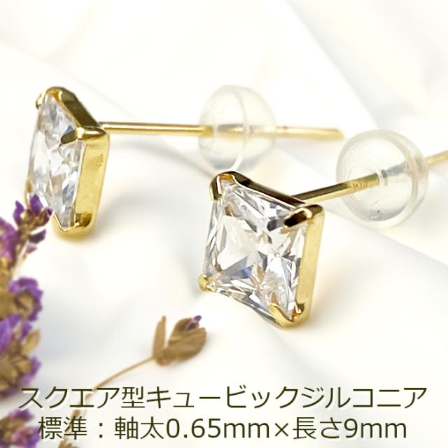 セカンドピアス 18金 明日が変わるキュービックジルコニア スクエア型 ピアス 標準 軸太0.65mm 長さト9mm CZ 5mm角 大粒 華やか レディース 【品質・破損保証つき】