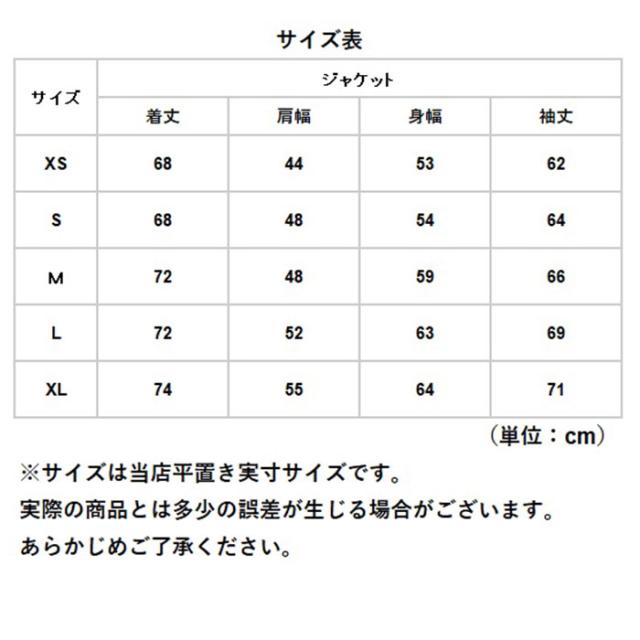 | 注意点 | ※お洗濯の際は、ジャケットを裏返しにして、水もしくは水温30度以下のぬるま湯で洗濯機洗いが可能です。漂白剤はご使用にならないでください。 ※タンブル乾燥は低温で行ってください。 ※アイロンがけやドライクリーニングはお避けください。 ※配送の方法によっては、商品に多少のシワ等ができる場合がございますが、出来る限りお客様にリーズナブルな価格帯でご提供するためです。ご了承くださいませ。 ※採寸方法の違いにより、多少の誤差がある場合がございます。 ※カメラやモニターの性質により、画像と実物の色の違いがある場合がございますのでご理解願います。 |