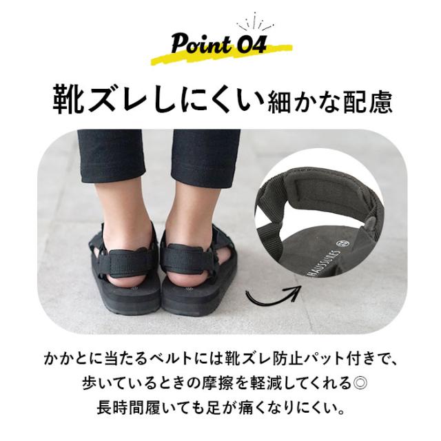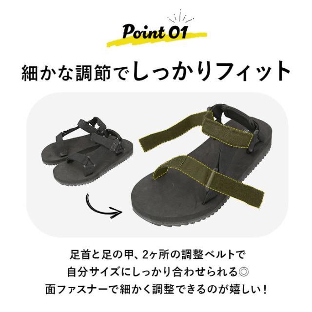 | 商品説明 | ・お出かけやレジャーシーンで大活躍!キッズ用のスポーツバンドサンダル。 ・足首と足の甲、2ヶ所の調整ベルトで自分サイズにジャストフィット!マジックテープで着脱しやすく、長さ調整も簡単。 ・かかとに当たるベルトには靴ズレ防止パット付きで、歩いているときの摩擦を軽減。長時間履いても足が痛くなりにくい。 ・ソールの素材には軽量でクッション性のあるEVA素材を採用。軽くて快適な履き心地。 ・底面には凹凸のあるゴム素材を使用しているから、滑りにくく安全。 ・ビーチサンダルのように素足で気軽に履くのはもちろん、ソックスの上から履いてもOK♪ |