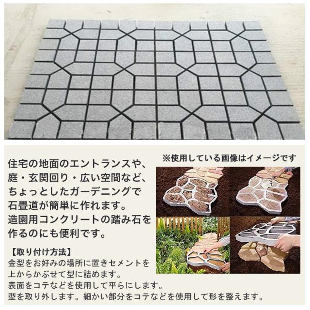 庭のアプローチ・玄関回り・エントランスなど、ちょっとしたDIYで石畳道が簡単に作れる成型モールドです。