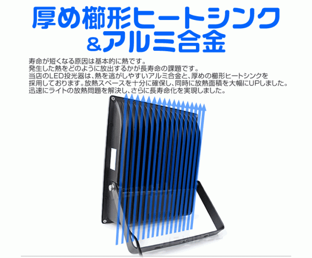 | 商品仕様 | サイズ(約):315mm×380mm×90mm 重量(約):4.9kg ボディカラー:ブラック ルーメン:15000LM 照射角:120度 LED発光色:昼光色(6000K) 入力電圧:85〜265V 防水規格:IP65 本体:アルミ合金 照射面:強化ガラス コードの長さ(約):3.0m(プラグ付・スイッチ無) |