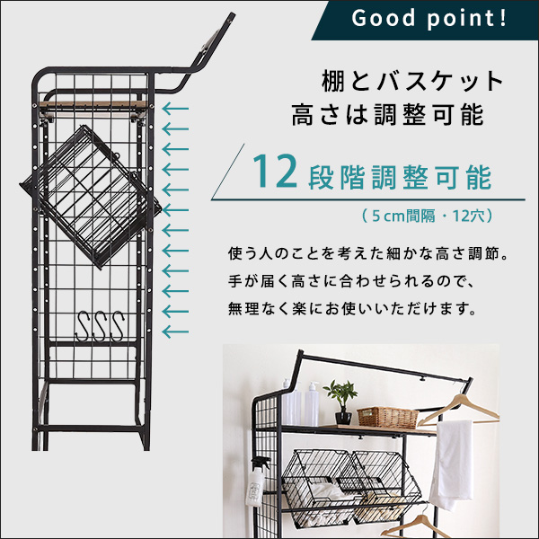 棚とバスケットの高さは12段階調整可能です。
