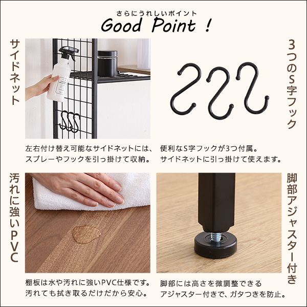 棚板裏面には、ズレ落ち防止ストッパーが4つ付いているので、万が一の落下を防ぎます。