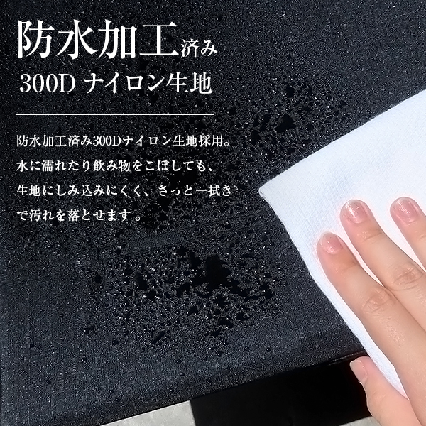 防水加工済み300Dナイロン生地を採用。水に濡れたり飲み物をこぼしても、生地にしみ込みにくく、さっと一拭きで汚れを落とせます
