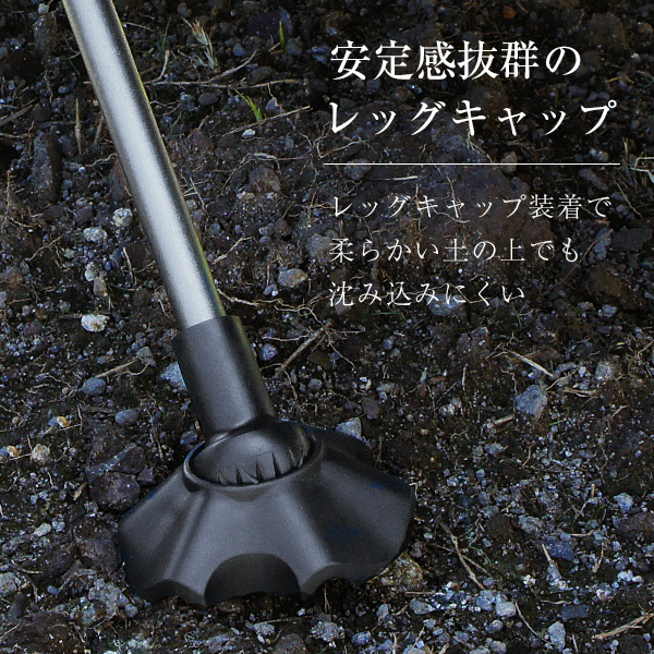 柔らかい土の上でも沈み込みにくいレッグキャップ付き
