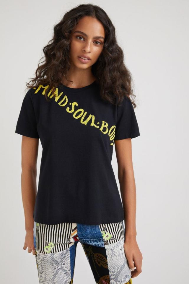 デシグアル/ラインストーンのメッセージ付きレディーススリムTシャツ