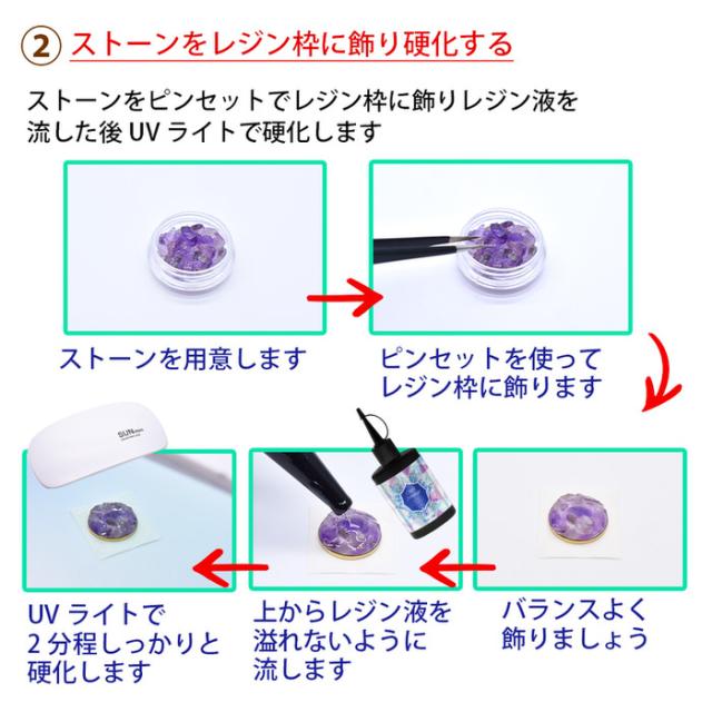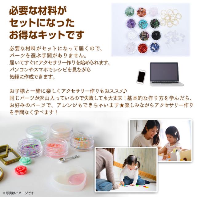 必要な材料がセットになっていますので、パーツを選ぶ手間がありませんので、すぐに作成を始められます。(レジン液は別売りとなりますので、別途ご用意ください。)