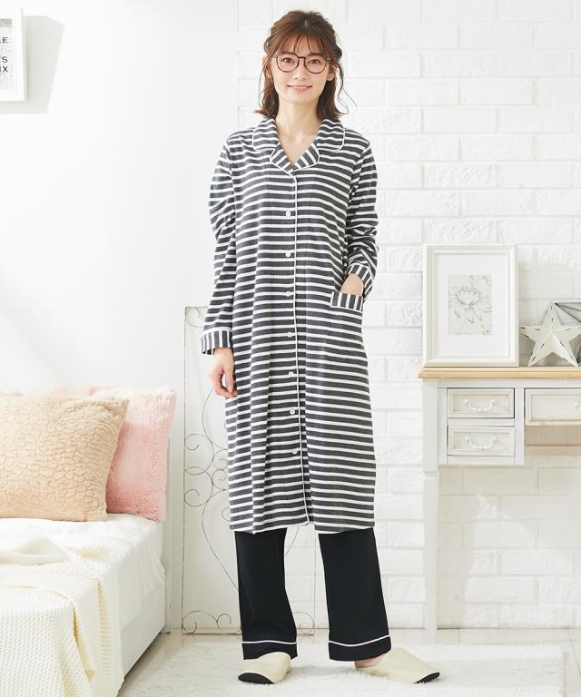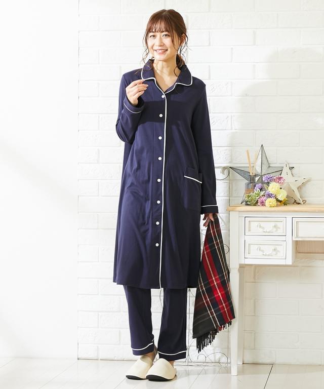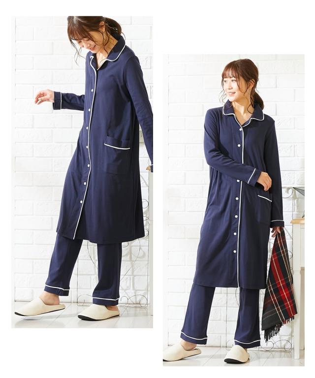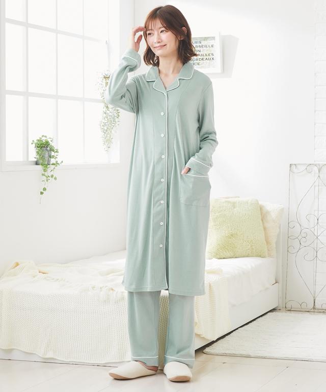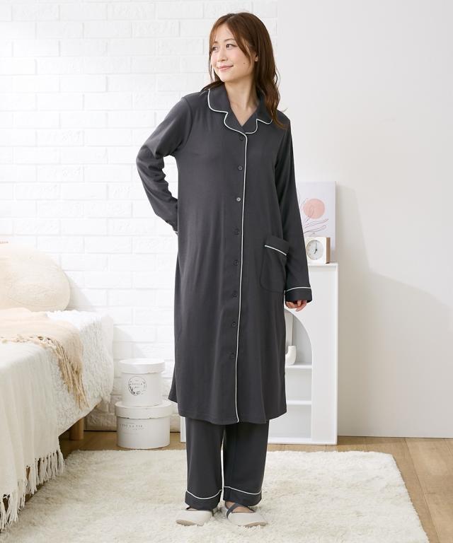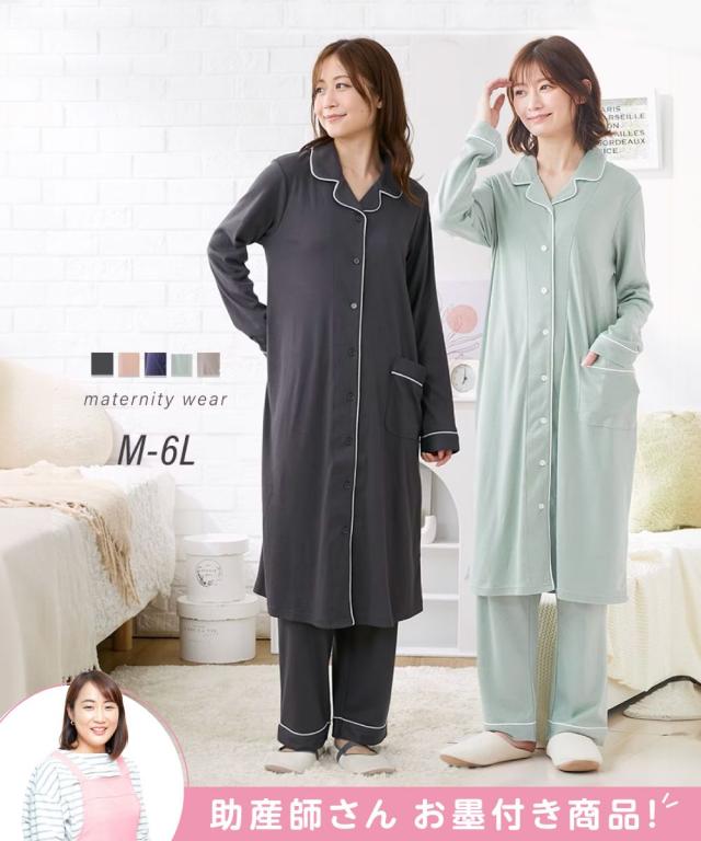 衿付でキチンと感がありながら、カットソー素材でやわらかく、着心地ラクチン 長めの着丈なのでパンツなしでの着用もOK。 前ボタン開きなので、入院時の診察にも便利です。 胸部分はスナップボタンなので、赤ちゃんを抱っこしたまま片手でカンタンに開けられます。 一番上のボタンは普通のボタンなので、片手でスナップボタンをはずしても全開にならず、さっと授乳口ができるのがうれしいですね。 前開き授乳タイプなので、産後、授乳期以降もパジャマとして使いやすいです。 パンツはボタン付のゴム仕様でウエスト調節が簡単にできます。 出産準備にもぜひどうぞ。 ・産前から産後に使う ・トップス:授乳機能付(前ボタン) ・パンツ:ウエスト調節可 ・秋春素材