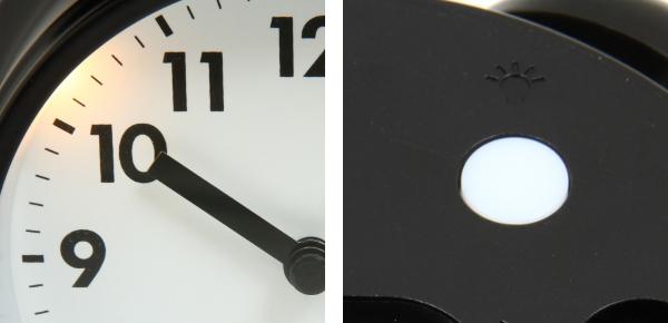 背面にあるライトスイッチを押すと文字板にライトが点き、暗闇でも時刻を確認できます。