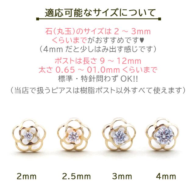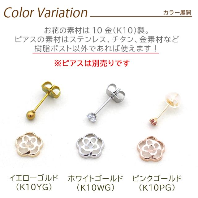 ステンレスやチタンといった硬めの素材から、やわらかい18金まで使えるよう、硬度と耐久性を考え、お花の着せ替えピアスは10金でお作りしています。 |