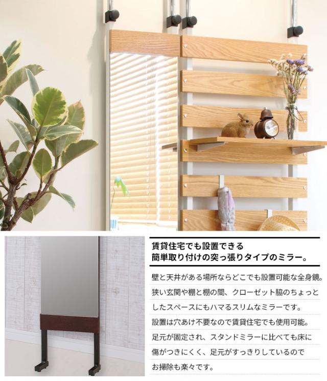 壁に穴を空ける必要がない突っ張りタイプの全身鏡。