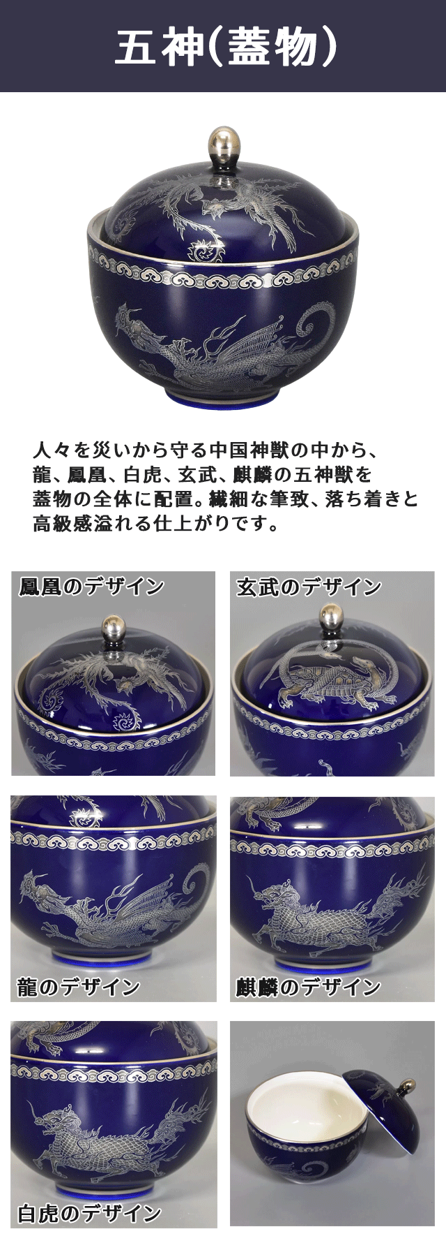 ・人々を災いから守る中国神獣の中から龍、鳳凰、白虎、玄武、麒麟の五神獣を蓋物の全体に配置。