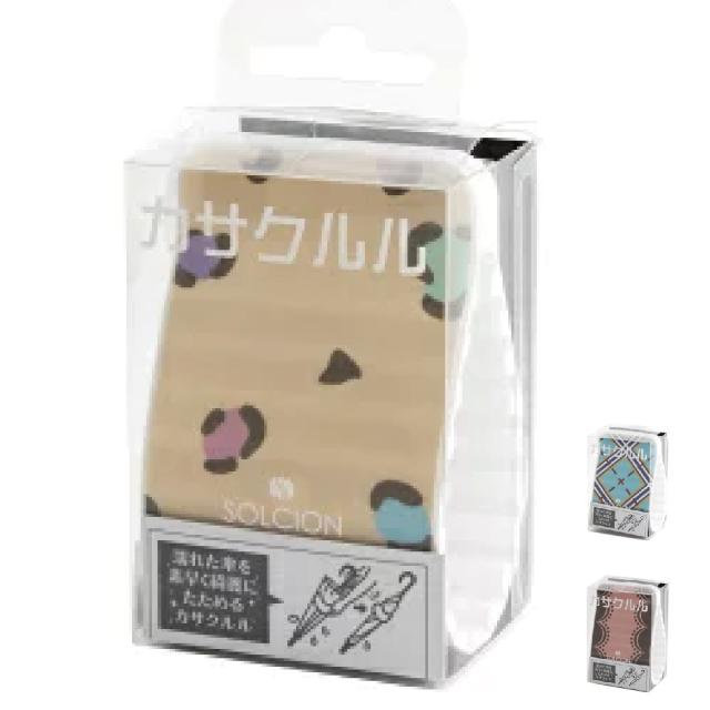 傘をたたむときに手が濡れにくく、自分の傘が一目でわかる傘用アクセサリー、SOLCION(ソルシオン)社のカサクルルです。