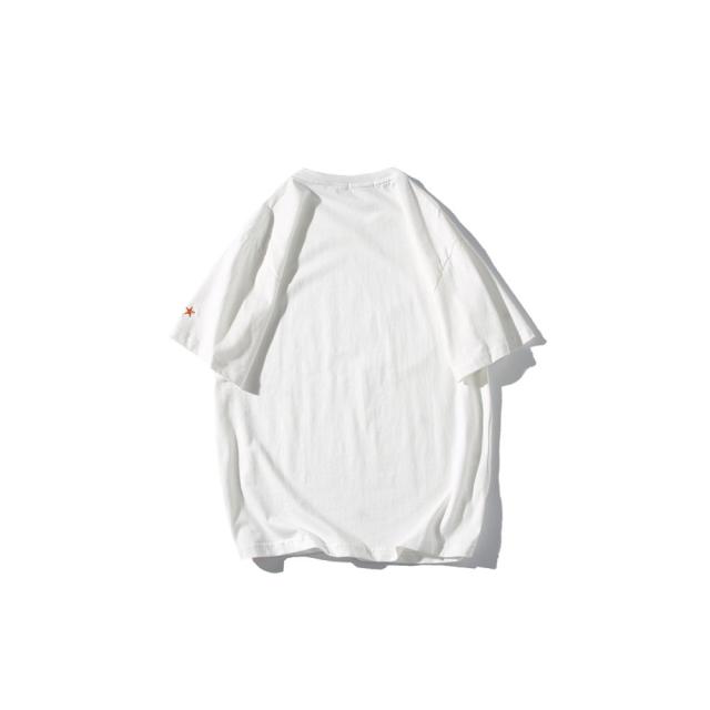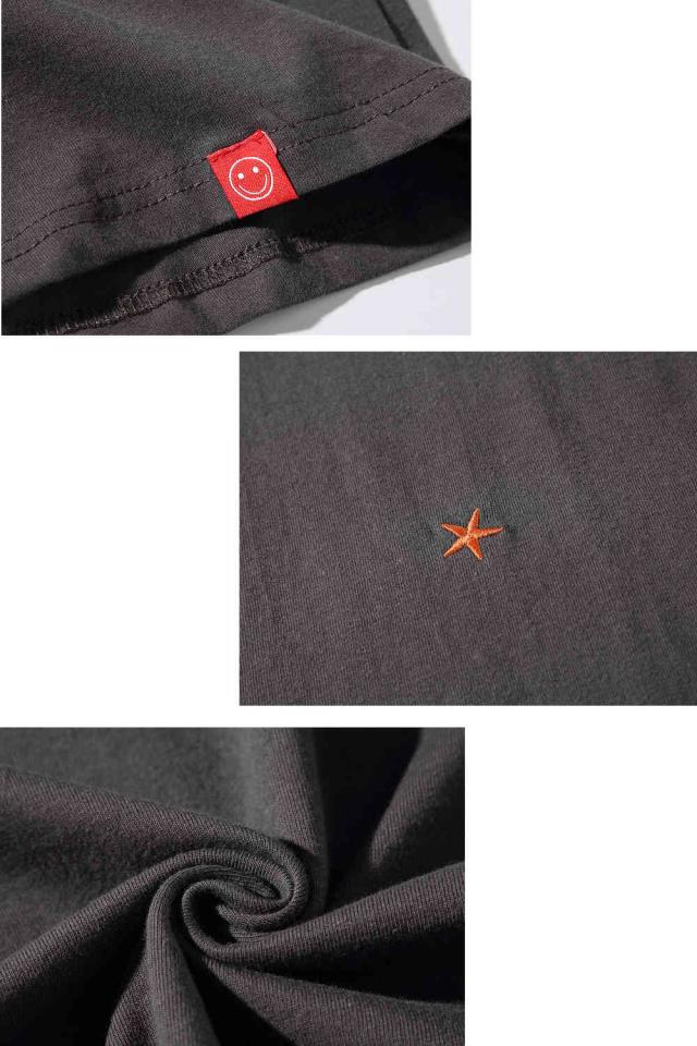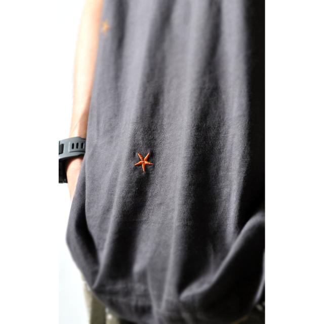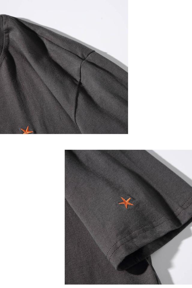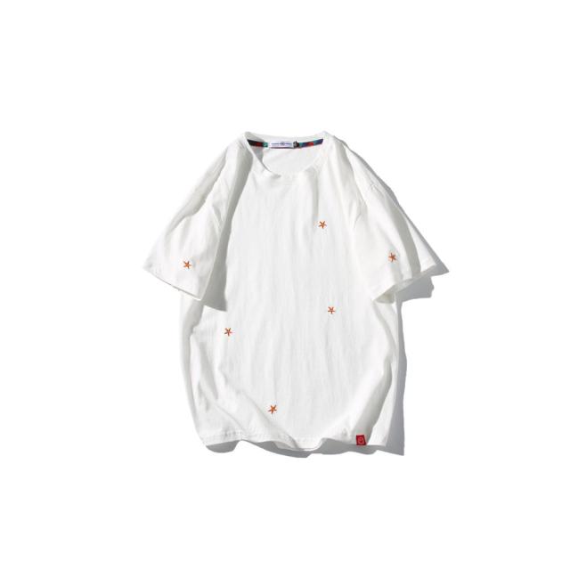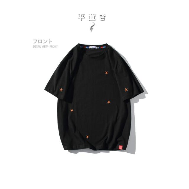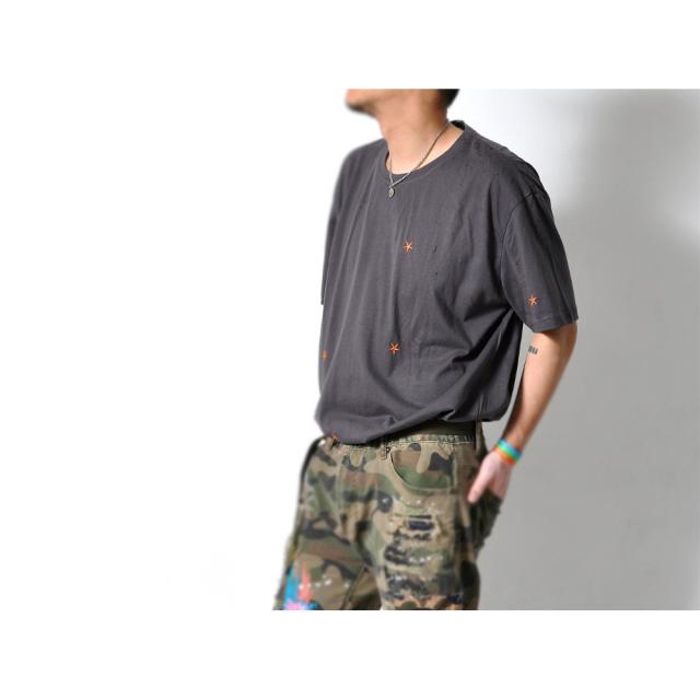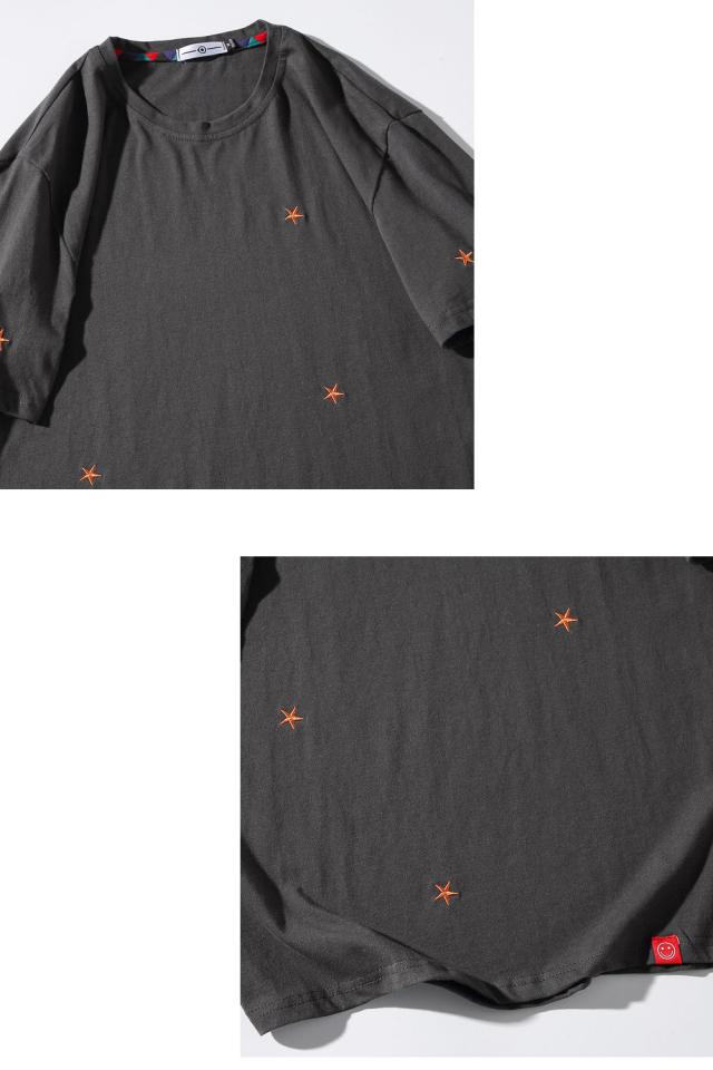 ★刺繍された星が散りばめられた半袖Tシャツ★アクセントになるオレンジ色の糸で刺繍された星が程よく配置され