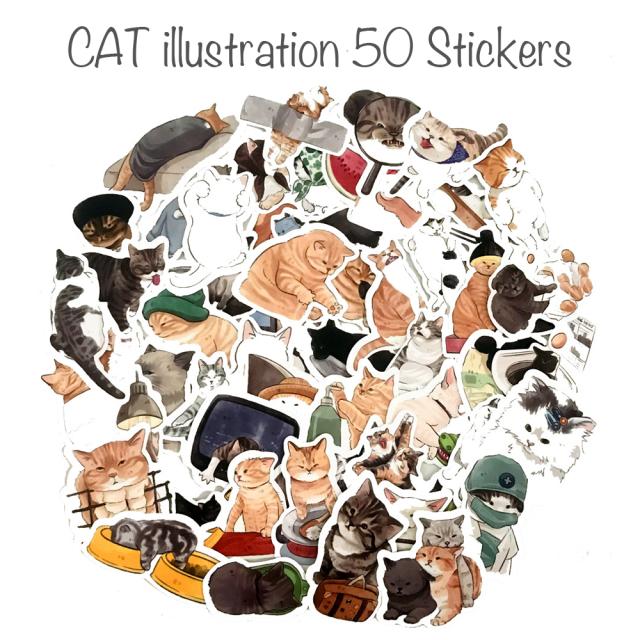 メール便 送料無料 ネコ イラストレーション ステッカー 50枚セット PVC 防水 シール ねこ 猫 キャット スーツケース MacBook