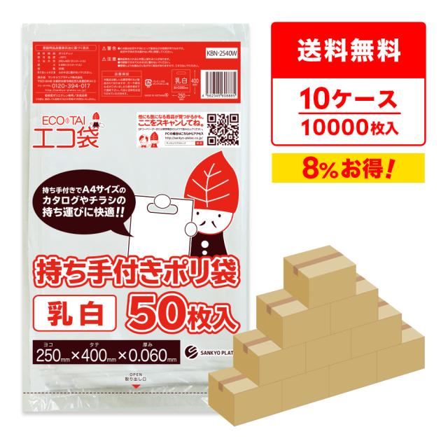 持ち手付きポリ袋 A4サイズ 乳白 25x40cm 0.060mm厚 50枚x20冊x10箱 KBN-2540W-10 袋 ホワイト 手提げ袋 持ち手付き 小判抜き袋 小判穴持ち手付き 説明会 イベント 展示会 サンキョウプラテック 送料無料