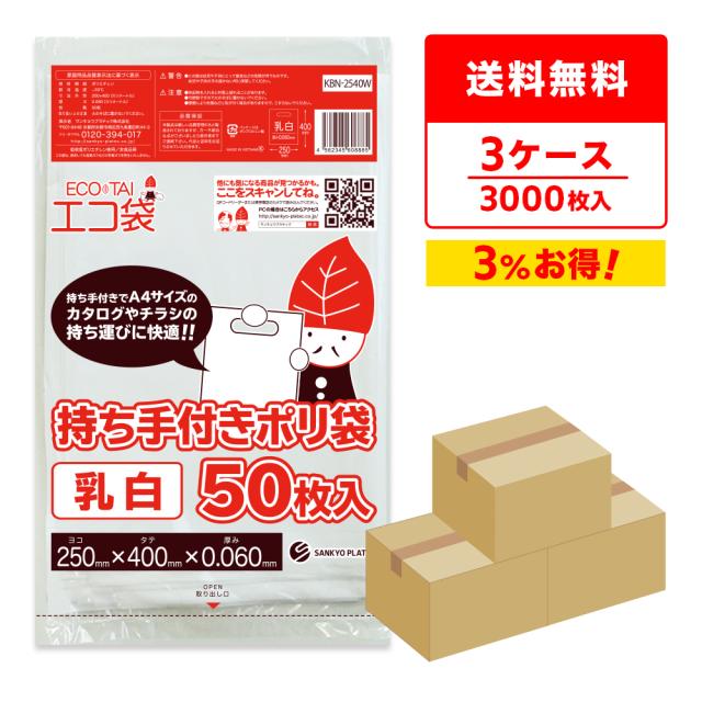 持ち手付きポリ袋 A4サイズ 乳白 25x40cm 0.060mm厚 50枚x20冊x3箱 KBN-2540W-3 袋 ホワイト 手提げ袋 持ち手付き 小判抜き袋 小判穴持ち手付き 説明会 イベント 展示会 サンキョウプラテック 送料無料