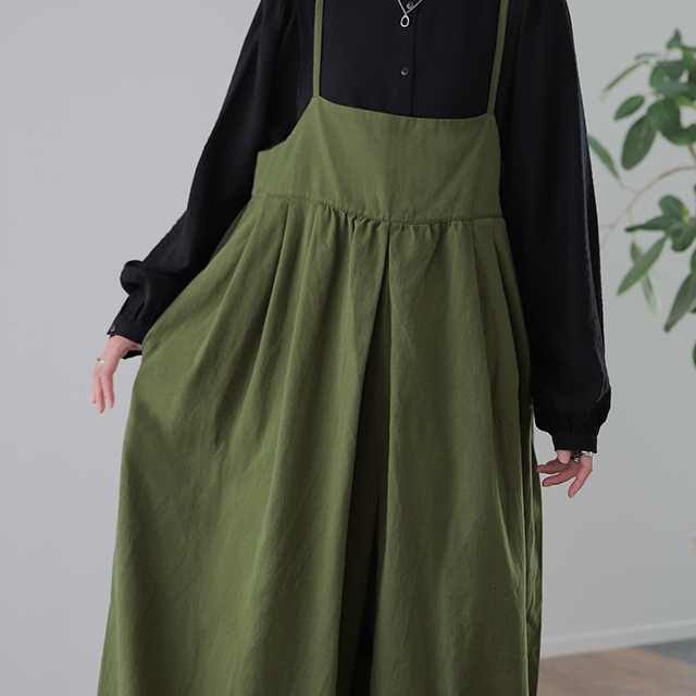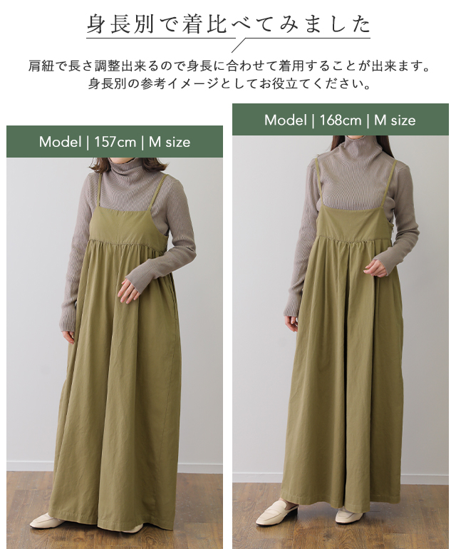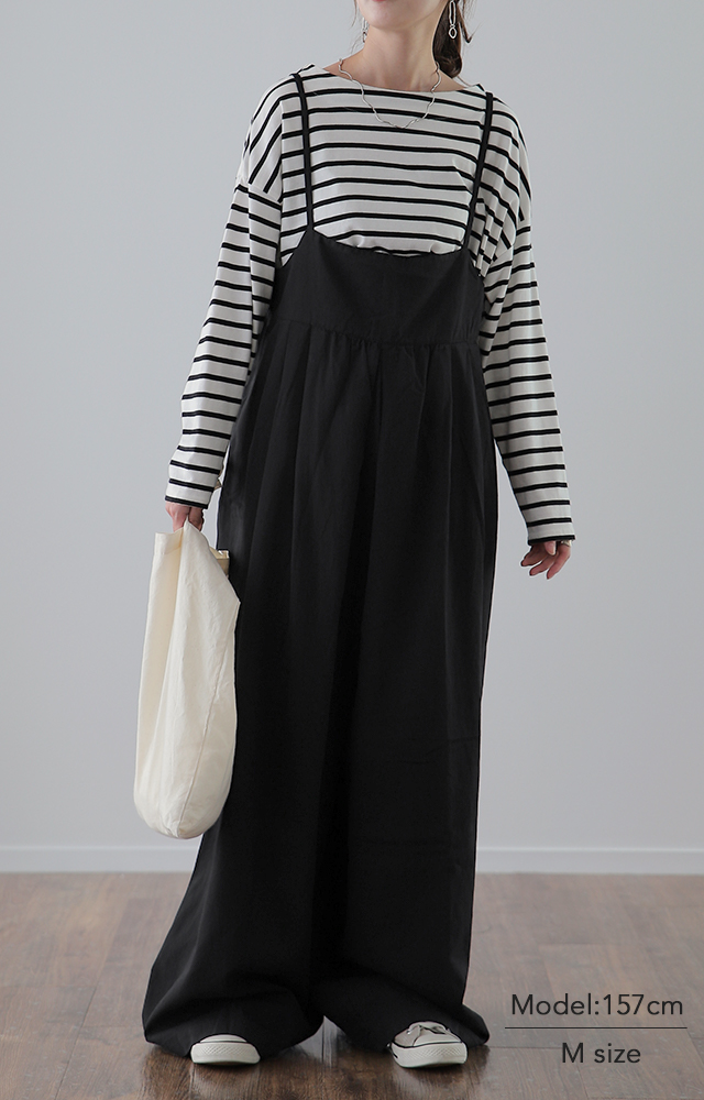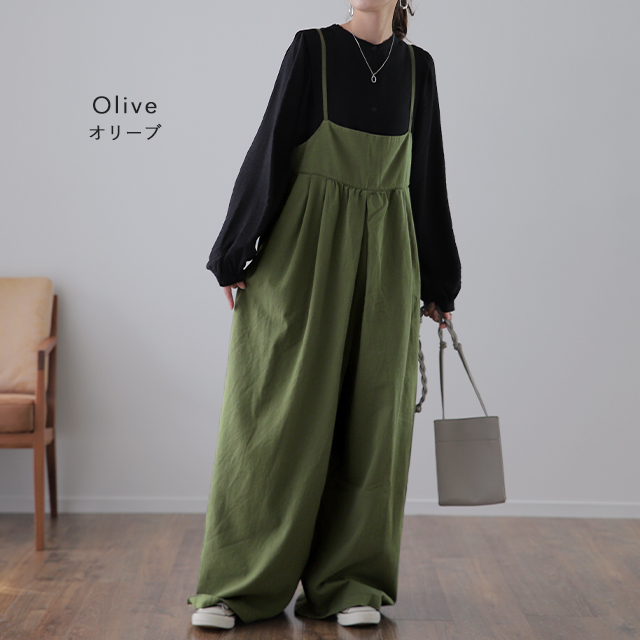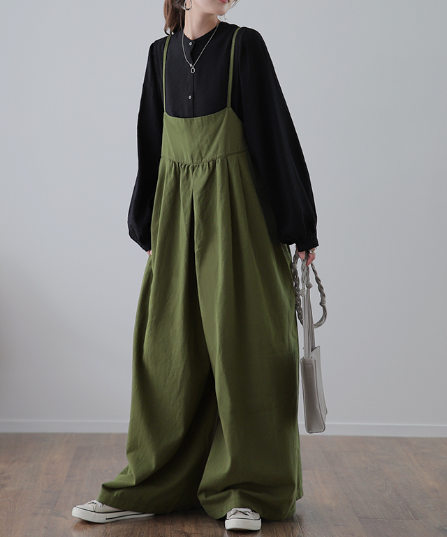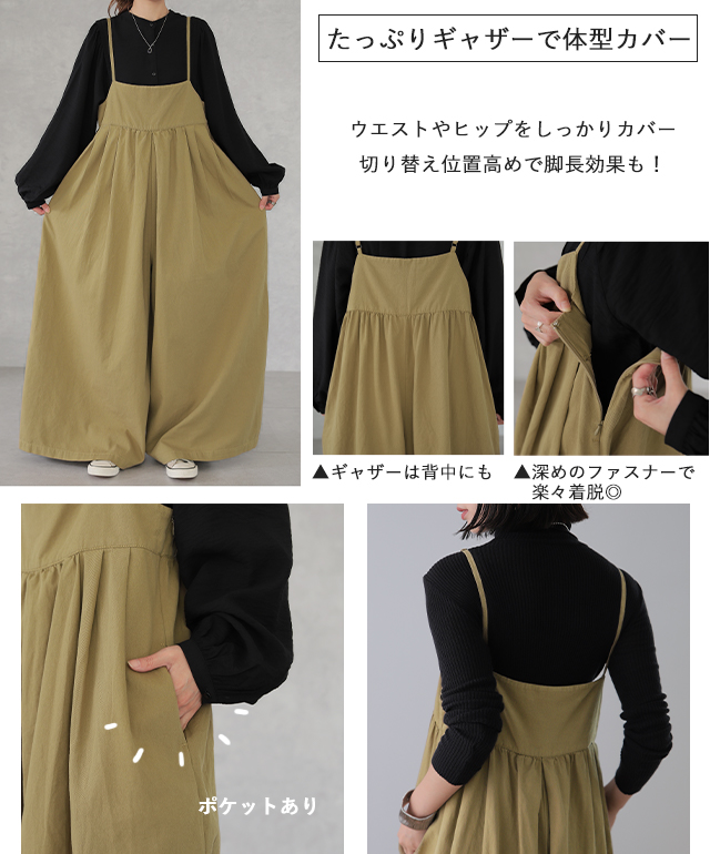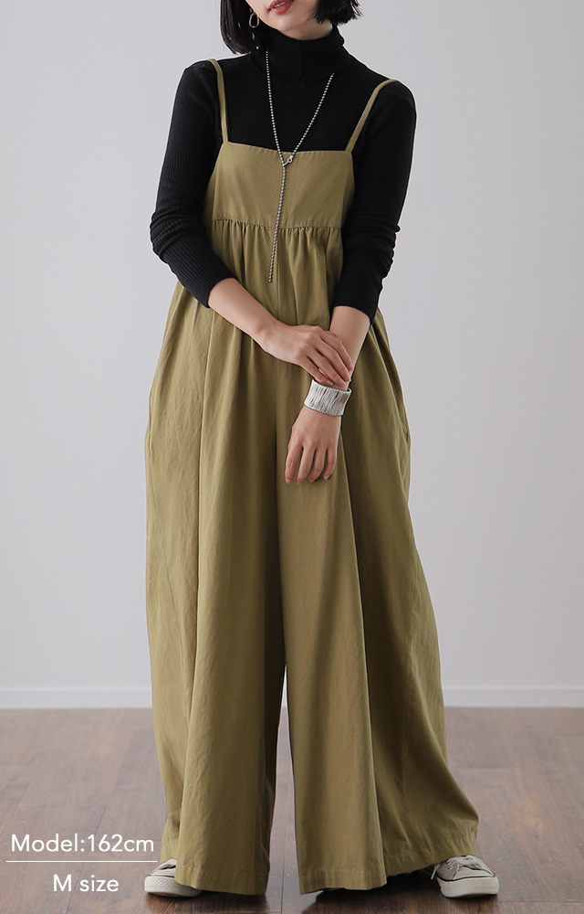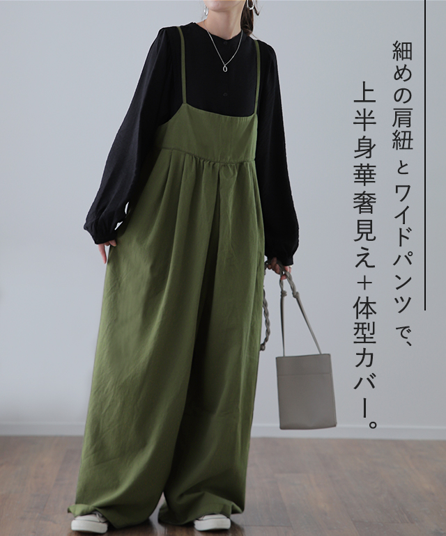 華奢紐 ×ワイド サロペット オールインワン レディース キャミソール 大きいサイズ サロペ ワイドパンツ パンツ ワイド キャミ 体型カバー ビッグシルエット ゆったり つなぎ コットン100% ロング 黒 カーキ 冬 秋 秋新作