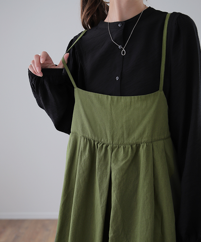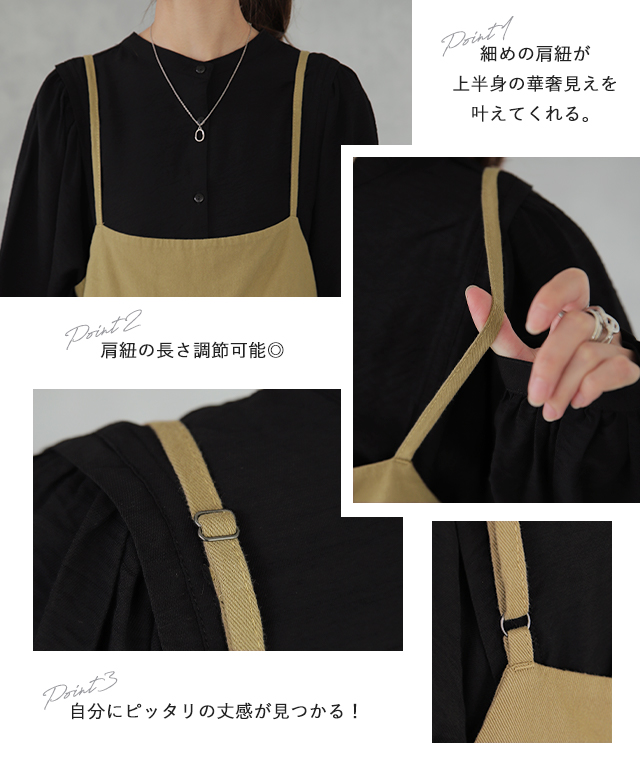 細めのストラップとボディラインを拾わないシルエットで体型カバーにも◎。