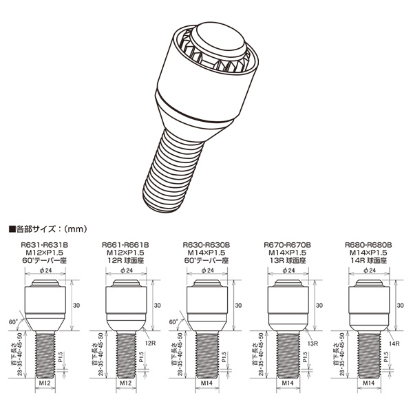 KYO-EI ブルロックリガード ボルト ブラック 1個 BullLock 【補充用パーツ】 M14×P1.5 14R球面座 首下28mm Y8028B