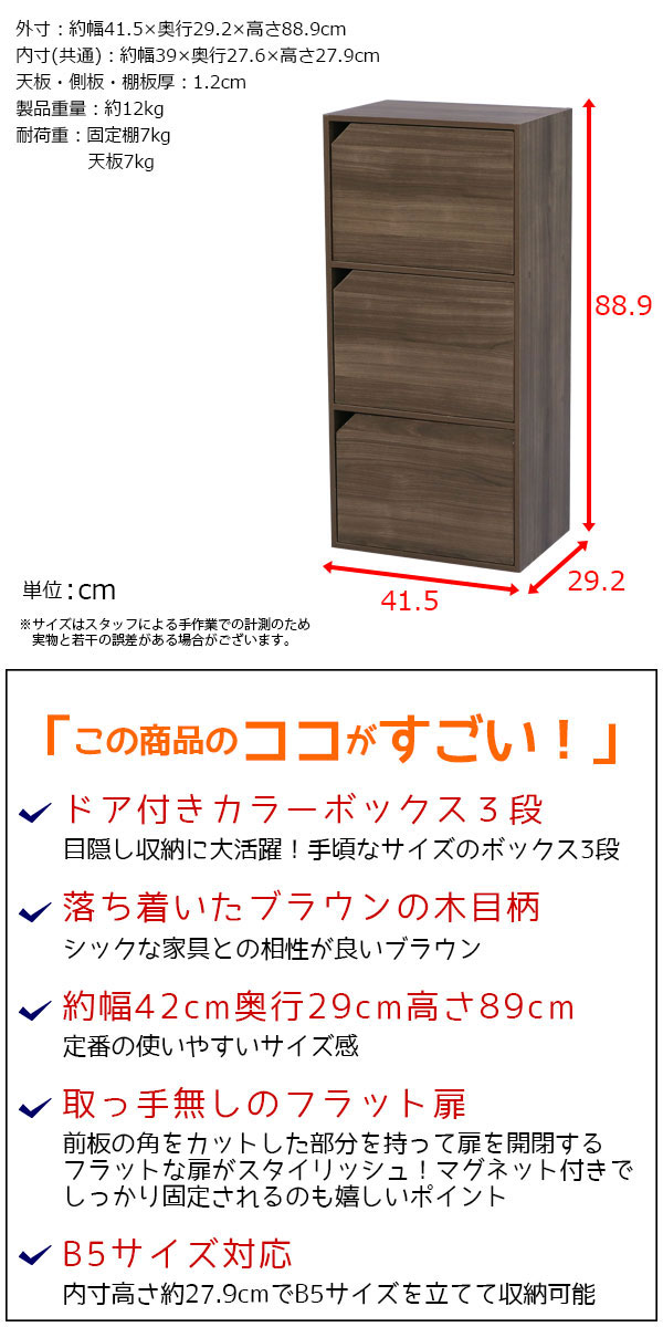 カラーボックス3段 フラットドア付き ブラウンCA-8942の説明