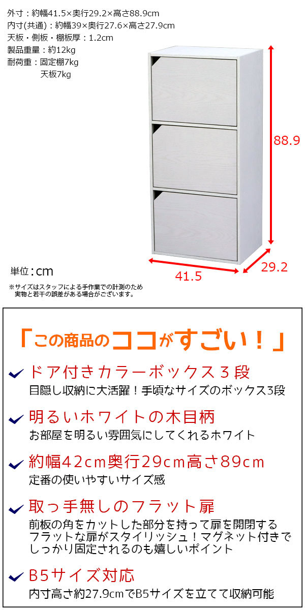 カラーボックス3段 フラットドア付き ホワイトCA-8941の説明
