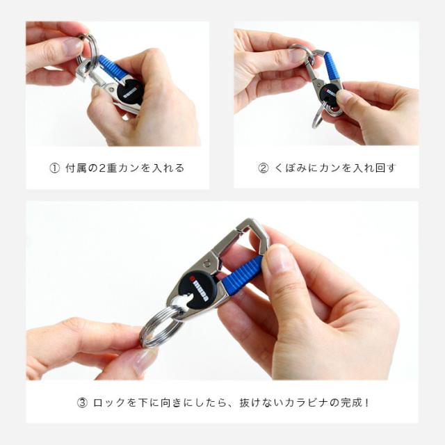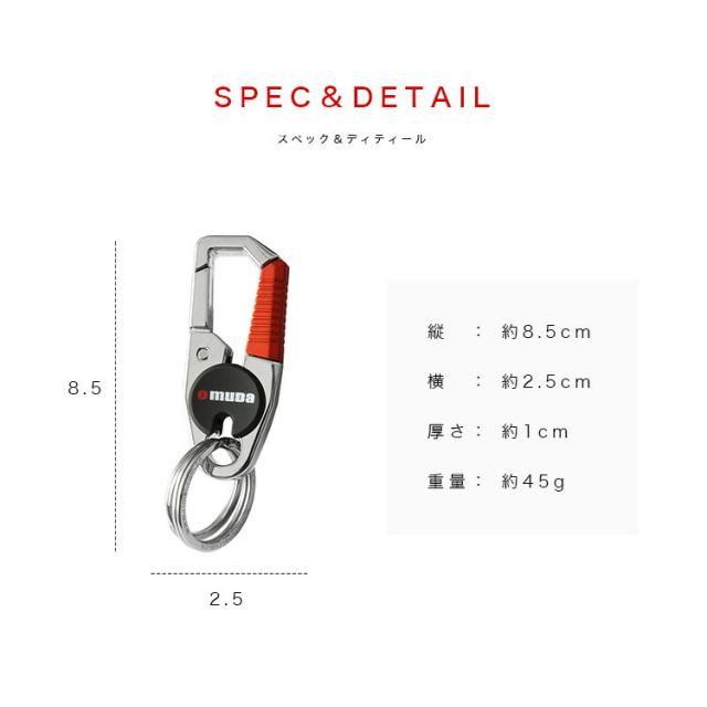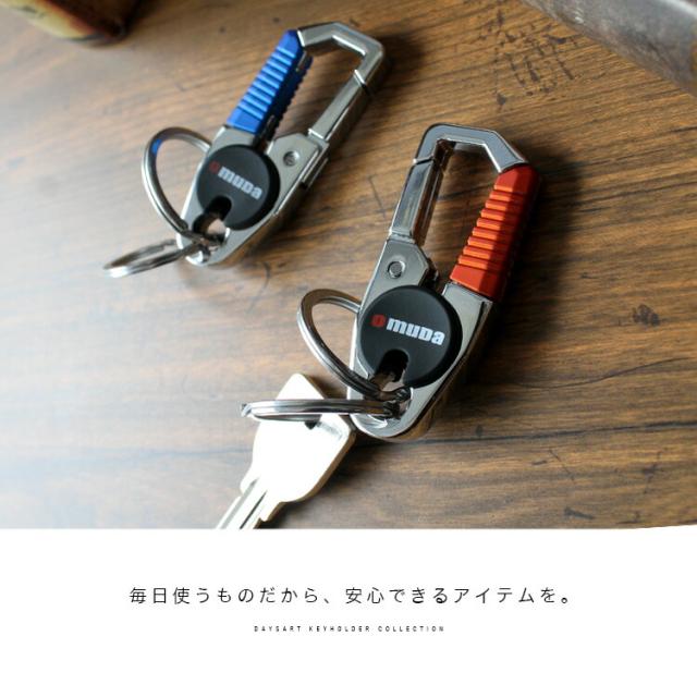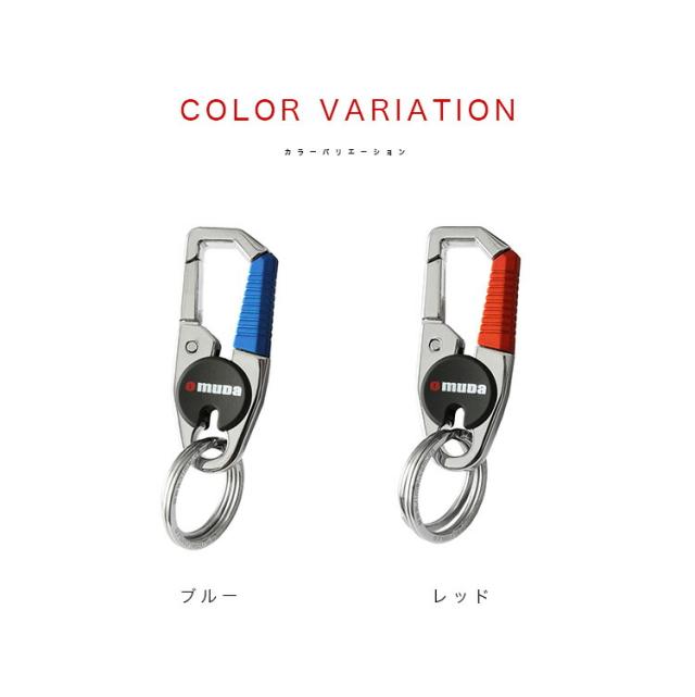シンプルなデザインのカラビナキーホルダーです。ブルーとレッドのカラー部分はマットな質感でアクセントになっています。キーリングがカラビナから抜けないようにロックできる構造となっており、鍵などを安心して付けられます。単体で使用するのはもちろんウォレットチェーンなどのレザーアイテムと組み合わせても使えます。