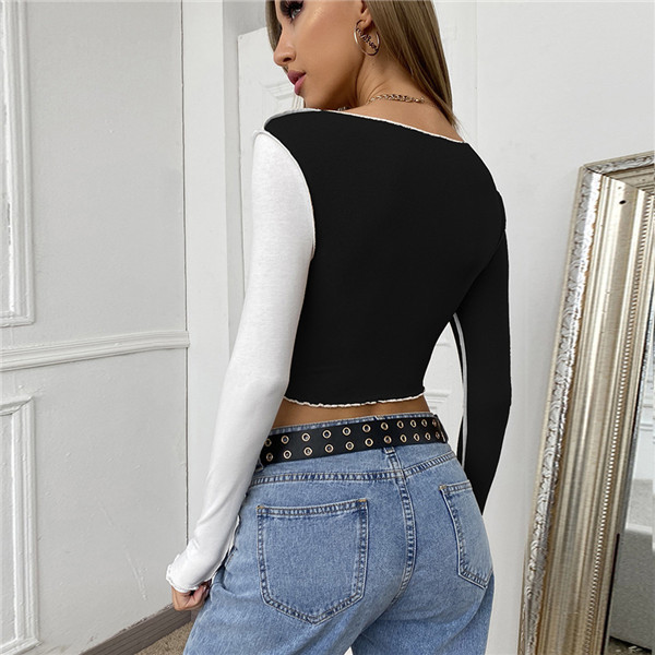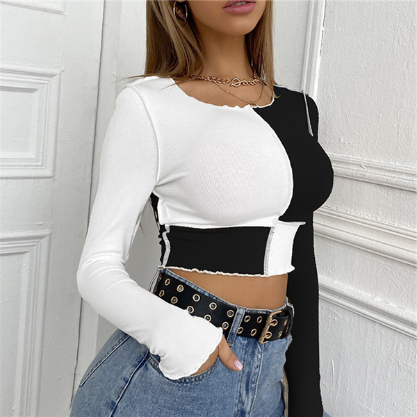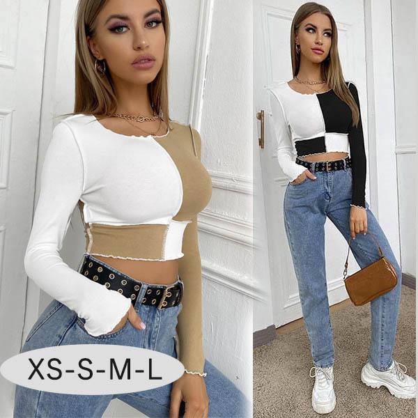 セクシー トップス レディース スリムフィット 長袖Tシャツ つなぎ合わせデザイン ショート丈 長袖 オシャレ B系 XS S M L dd090c0c0c0