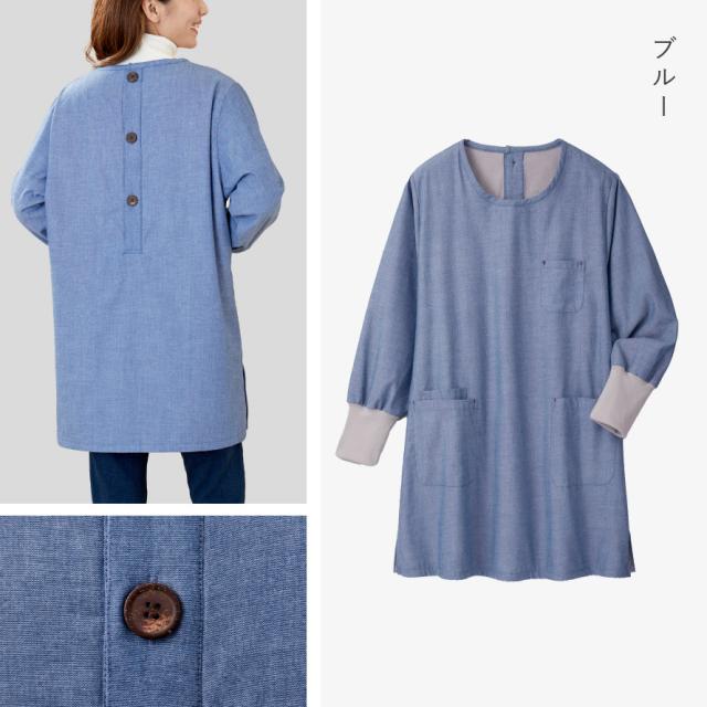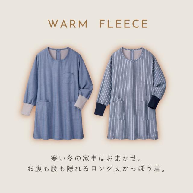 すっぽりかぶって冬の家事はおまかせ、寒い季節の家事服にぴったりのチュニック丈かっぼう着。身頃が裏フリース付きで暖かく、袖は一枚仕立て(フリースなし)で動きやすい。