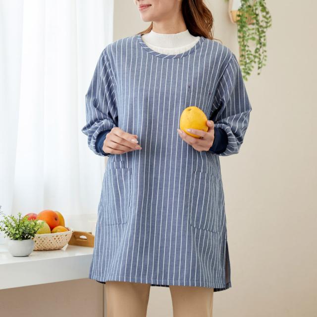 割烹着 冬 エプロン かっぽう着 レディース フリース 裏起毛 あったか 暖かい 長袖 かぶる ポケット付き ゆったり 保育士 かっぽうぎ おしゃれ かわいい お尻が隠れる M L LL 3L ブルー ネイビー ストライプ ロング丈 仕事用 家事 シンプル 秋冬 防寒 袖付き リブ袖