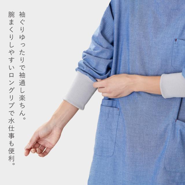 袖口はロングリブでアームバンドいらず。袖が邪魔にならず腕まくりしやすいので水仕事にとっても便利、家事もはかどります。風の侵入も防ぎます。