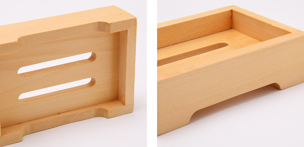 | 水切れも良い 内側にある水切り用のすき間が、石けんを乾いた状態に保ち、石けんを清潔な状態に保ちます。 | 安定感のある作り 木に厚みがあるので、安定感があり石けんが滑り落ちる心配がないので安心です。 |