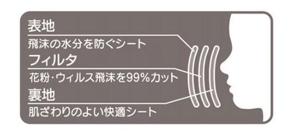 | 材質 | 表地:ポリエステル フィルタ:ポリプロピレン(メルトブロー不織布) 裏地:ポリプロピレン 耳ひも部:ポリエステル、ポリウレタン ノーズワイヤー:ポリエチレン |