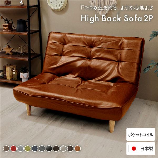 こちらは「ハイバックソファー/ローソファー【2人掛け ビンテージPVC生地 キャメル】脚部:ナチュラル リクライニング 幅121cm 日本製 合皮」の商品ページです。