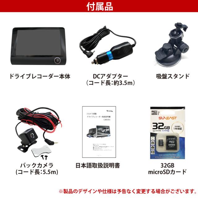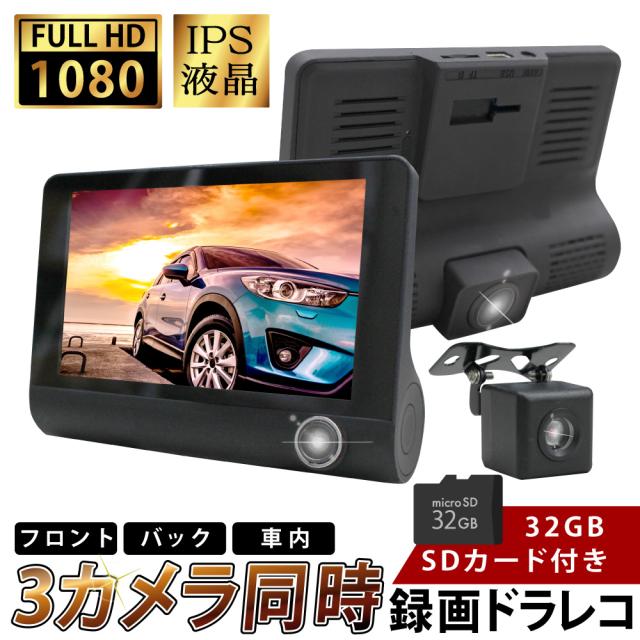【32GB SDカード付】ドラレコ 前後 車内 撮影ドライブレコーダー 3カメラ 車内 車外 録画 バックカメラ 4インチ IPS 当て逃げ あおり運転 Gセンサー 送料無料