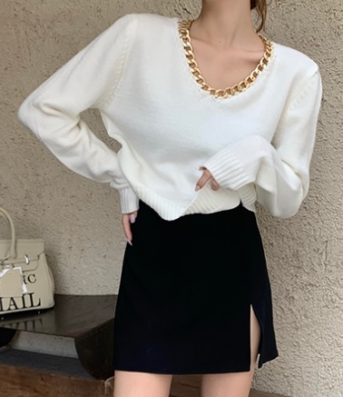 トップス セーター おしゃれ カジュアル シンプル ゆったり 白 黒 ニット 綿 無地 Vネック 長袖 秋冬 チェーン 鎖 大人可愛い クール カッコイイ 10代 20代 30代 お出かけ デート 着まわし 人気 トレンド