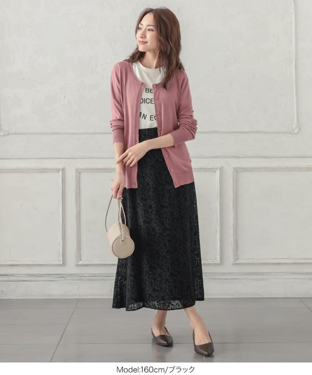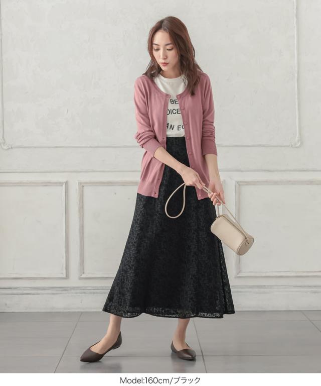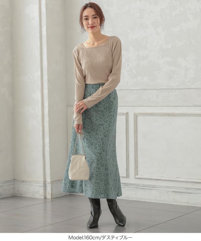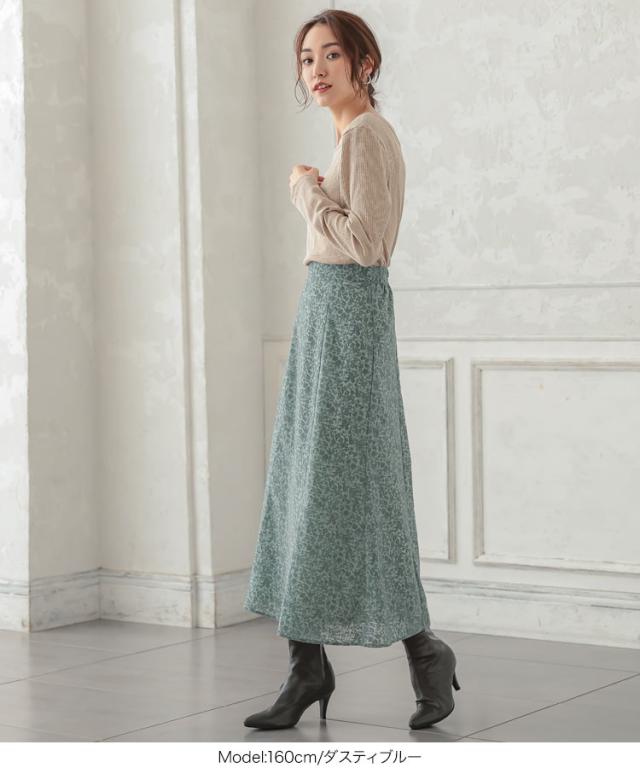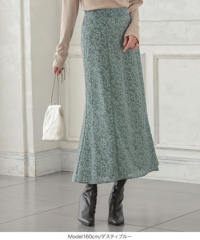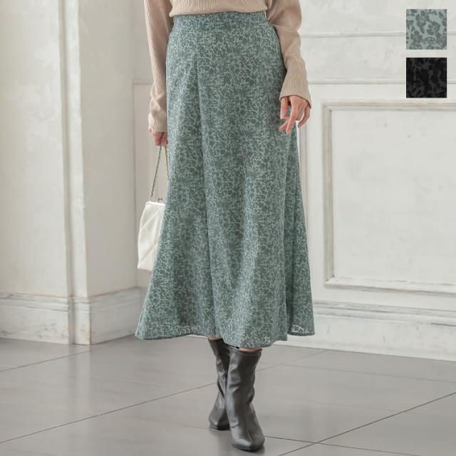 繊細な花模様のフロッキーが女性らしい印象を叶えるセミフレアスカート。くすみカラーで大人の上品さをプラス。シンプルなTシャツやニットに合わせるだけでエレガントなコーディネートが完成します。【素材・サイズ感】フレアシルエットで下半身カバーしつつ、柔らかな生地感で上品な雰囲気に。広がりすぎないセミフレアシルエットで、オンオフどちらのシーンにも似合う優秀アイテムです。バックゴム仕様でラクチンな履き心地も嬉しいポイント。※キャンセル/変更不可※お届けまでの日程について