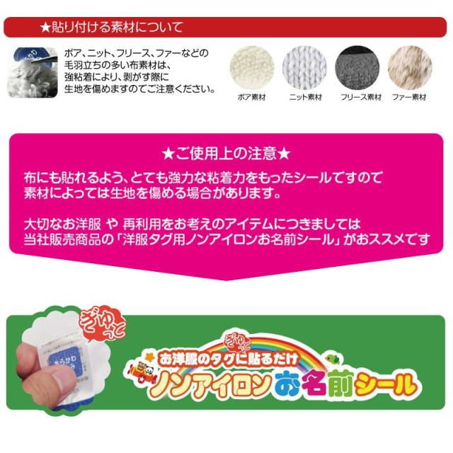 ※超粘着シールのため、大切なお洋服や再利用をお考えのアイテムには洋服タグ用お名前シールをおススメいたします。