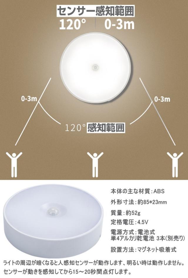 2個セット 人感センサー ライト 人感 電球 ライト 人感センサー LEDライト 自動オンオフ ライト 電球色 昼白色 マグネット吸着 電池式 補助照明 屋内 人感センサーライト 丸形 小型 コンパクト