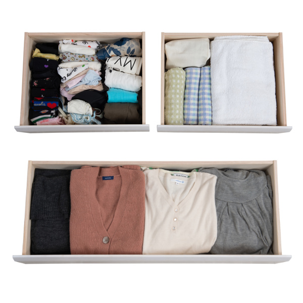小引出しは下着類やタオルなどの小物、レールの付いた大引出しにはアウターやズボン類などもしっかり収納できます。衣類収納に適した桐タンスで、機能性と収納力とを兼ね備えています。