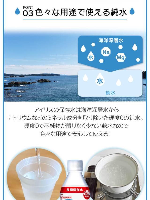 アイリスの保存水は高知県室戸岬の海洋深層水からナトリウムなどのミネラル成分を取り除いた硬度0の純水。