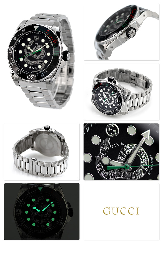 7年保証キャンペーン グッチ ダイヴ 45mm スネーク 蛇 クオーツ 腕時計 メンズ YA136218 GUCCI DIVE アナログ ブラック ◆1921年、グッチオ・グッチは革製品の会社を起業し、フィレンツェに小さな鞄店を開業。ブランドに対する彼のビジョンは、ロンドンと、彼がサボイ・ホテルで働いていた時に見た英国貴族の洗練された審美眼から培われたものです。財布や革製品以外にもアクセサリーや腕時計も品質の高さや、洗練されたデザインが人気で一気に高級ブランドの地位を確立しました。今では名を知らない人はいないぐらい世界的に有名なブランドです。 印象的なベゼルと文字盤にデザインされた蛇が存在感を演出。オンオフ問わずにお使い頂ける、様々なファッションに合わせやすいカラーリングも魅力です。