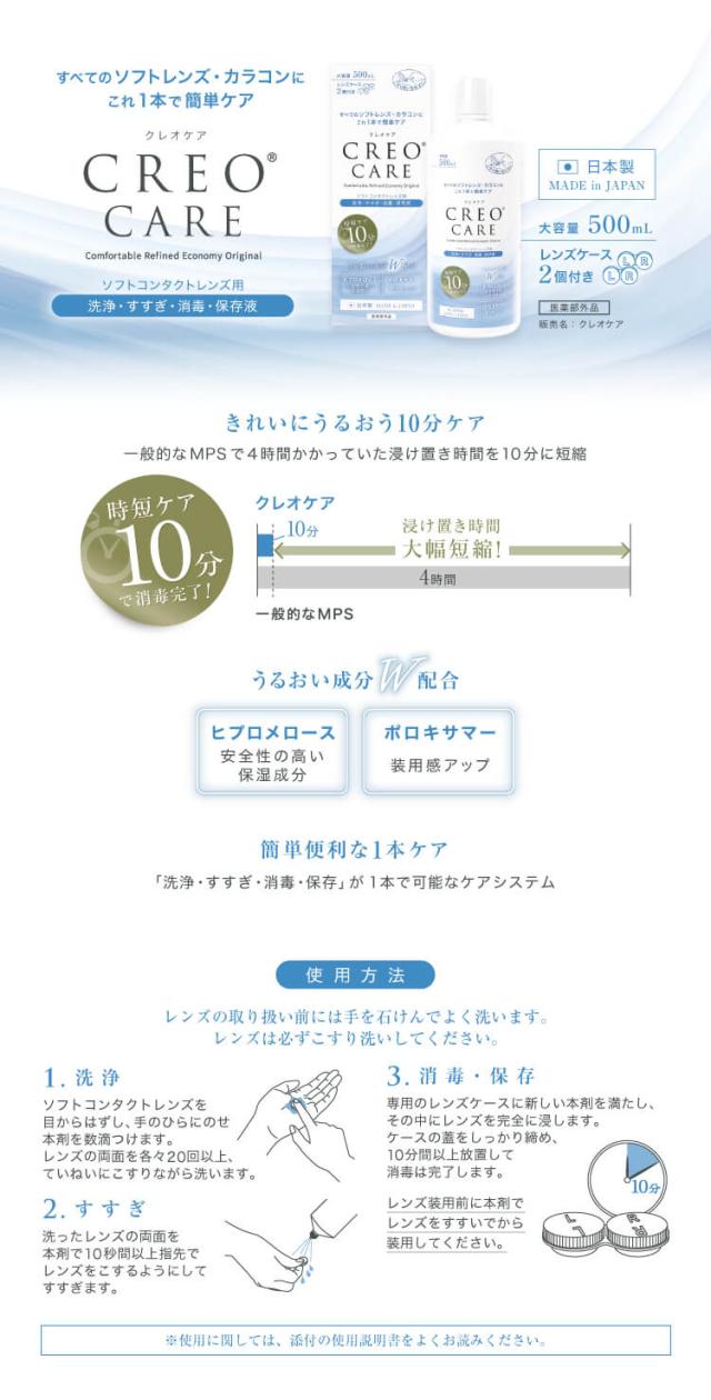 【送料無料】クレオケア(500ml)10箱 ソフトコンタクトレンズ ケア用品 洗浄液 消毒 すすぎ 保存 クレオ