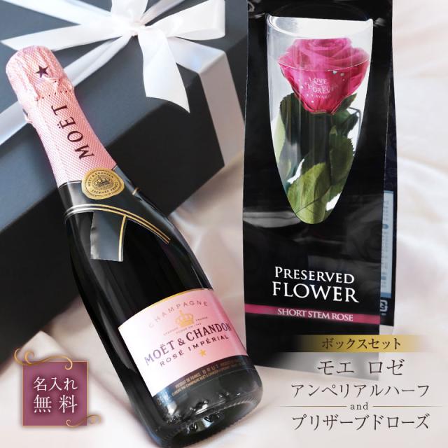 シャンパン プリザーブドフラワー 名入れ ギフト 花 シャンパンギフト セット プリザーブドローズ & モエ ロゼ アンぺリアルハーフ BOXセット 5営業日出荷 フラワー モエ・エ・シャンドン スパークリング ワイン 375ml