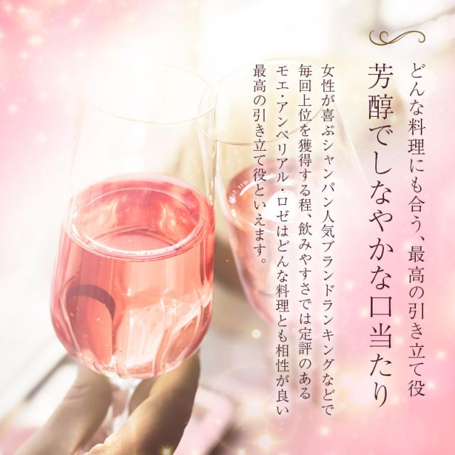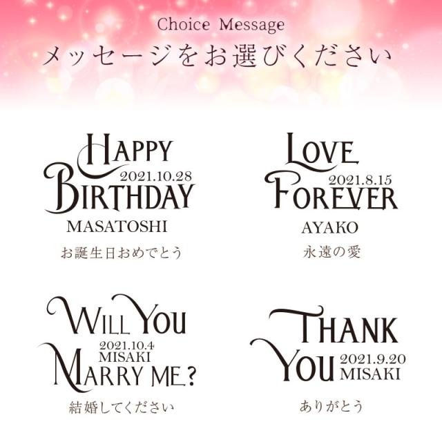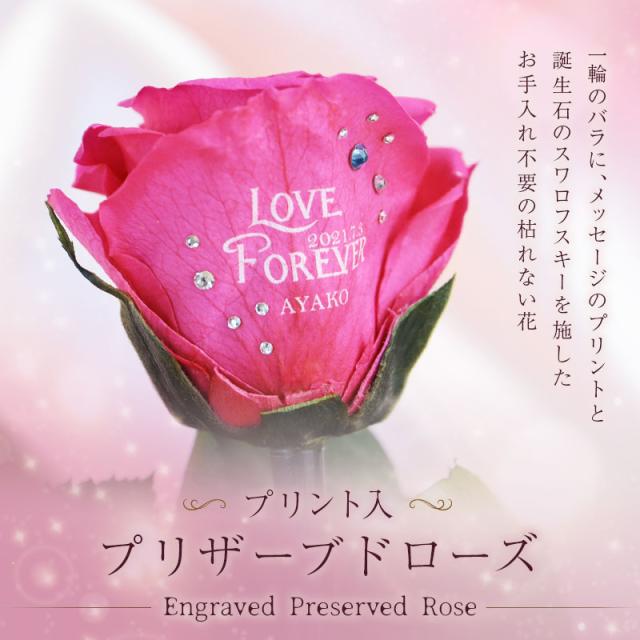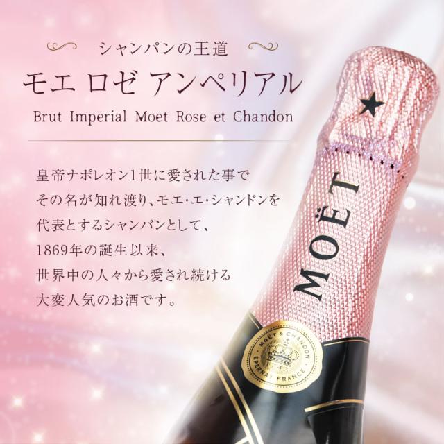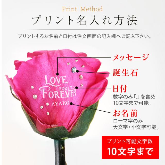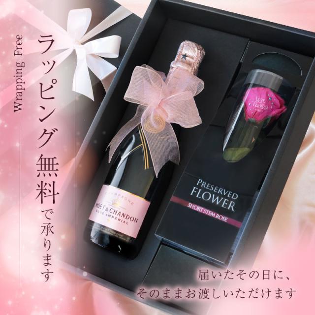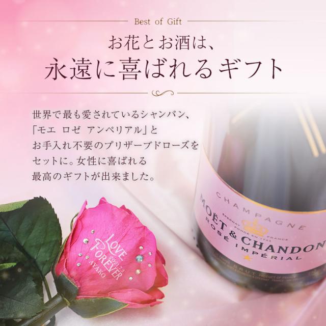 | \ 特別な花を、特別な日に / 「花とお酒」は永遠に喜ばれるギフトセット。 お祝いの定番であるプリザーブドローズに、 記念に残るメッセージと日付、特別感のある名入れを施します。 最も愛されるシャンパンブランド、 モエ・エ・シャンドン モエ・アンペリアルと セットでお届け。 絶対に外せない記念日は このギフトセットでお祝いを♪ 1. プリント入りプリザーブドフラワー - プリザーブドフラワー - 生花に特殊な加工を施したプリザーブドフラワーは、枯れることがなく水やりの必要もないことが大きな特徴です。 瑞々しい質感と柔らかさを長い間保つことができる、生花とドライフラワーの両方の良さを兼ね備えた 花材 です。 - 一輪のピンクのバラ - 「花の女王」とも呼ばれ、愛と美の象徴となっているバラは、 愛の告白や、お祝いのシーンでは欠かせない立役者です。 薔薇は、色や贈る本数によって花言葉が変わる、ということはご存じでしょうか? ピンクの薔薇の花言葉は「上品・しとやか」 そして、一輪を贈ることを意味するのは「あなたしかいない」 柔らかな色と、好意を表わす花言葉を持ったピンクのバラは、 大切な女性へと贈るのにふさわしいお花です。 - 名入れフラワーギフト - 今やフラワーギフトとして圧倒的な人気を誇るプリザーブドフラワー。 アレンジメントで独創性を表現したり、 名前を刻印したケースに収めて サプライズ を演出したりと、 さまざまなカタチで取り扱われております。 そんなプリザーブドフラワーをもっともっと特別なものに…と、 究極のオリジナリティを追及して誕生したのが、当店自慢のプリザーブドローズです。 花そのものに名入れするという斬新な発想は、他では見られない特別感を演出。 プリントの周囲に施した スワロフスキー の装飾は、まるでジュエリーのような高級感溢れる印象に。 名入れフラワーなら、ケースから取り出して飾っても特別感を損なわず、 生花のように直に触れながら、その美しさを堪能することができます。 スタッフの情熱と、繊細な花びらに細かな文字を印刷する、当店の高い技術を織りなして仕上げられたプリザーブドローズは、 ”あなただけに贈るプレゼント” このキャッチフレーズを謳うにふさわしい逸品です。 2. 記念に残るプリント 〔 日付プリント 〕 “この日の記憶をずっと残したい” そんな気持ちを叶える日付プリント。 目にする度に特別な日の思い出がよみがえります。 〔 選べる12種のメッセージ 〕 特別なギフトシーンにぴったりなメッセージが12種類。 大切な相手の事を想いながらお選びください。 ・ Happy Birthday お誕生日おめでとう ・ Love Forever 永遠の愛 ・ Will you marry me? 結婚してください ・ Thank You ありがとう ・ Just For You あなただけのために ・ Happy Wedding 結婚おめでとう ・ Anniversary 記念日 ・ Happy White Day ホワイトデー ・ Happy Mother's Day 母の日 ・ Merry Christmas メリークリスマス ・ Congratulations! おめでとう! ・ I'm proud of you! あなたを誇りに思います 〔 選べる12誕生石 〕 豪華に散りばめたスワロフスキーの中に、ひときわ目を惹く輝きを。 誕生石 を一粒アクセントに加え、デコレーションいたします。 ・ 1月 - ガーネット - ・ 2月 - アメシスト - ・ 3月 - アクアマリン - ・ 4月 - ダイアモンド - ・ 5月 - エメラルド - ・ 6月 - パール - ・ 7月 - ルビー - ・ 8月 - ペリドット - ・ 9月 - サファイア - ・10月 - トルマリン - ・11月 - シトリン - ・12月 - タンザナイト - 〔 お名前プリント 〕 名入れギフト専門店の当店が、気持ちを込めてお名前をプリントいたします。 「 どうして 名前入り が喜ばれるの? 」 自分の名前が入った商品は世界にただ一つだけ。 “ 自分の事を考えながら選んでくれたんだ ” そんな風に感じさせてくれます。 だから、相手を大切に想う気持ちがより伝わります。 さらにお名前プリントはずっと消えずに残るから、永く愛着を持って飾っていただけます。 だから、「名入れギフト」は大切な人に感謝の気持ちを伝えるのにぴったりなおくりもの。 私たちは、贈った人も受けとった人もみんなが笑顔になれる商品をお届けします。 3) 世界で最も愛されているシャンパン 記念日に贈る定番アイテムと言えば、 もう一つ忘れてはならないのが“シャンパン”。 シャンパン、といえば“モエ”という方も少なくないはず。 「モエ アンペリアル」は、モエ・エ・シャンドンを代表とするシャンパンとして、 1869年の誕生以来、世界中の人々から愛され続けています。 ロゼ は、大人の女性の心をくすぐる かわいいピンクラベルが特徴。 女性なら誰もが、ボトルの可愛さにうっとり。 箱を開けた瞬間の感動がさらにプラス♪ かわいいだけじゃない!人気のワケはこんな理由が。 ・ブリュット同様のドライ。さらにフルーティな香りが特徴 ・コクと余韻のある味わいで幅広いお料理と合わせて楽しめる 「 結婚祝いに喜ばれるロゼシャンパン人気ランキング 」 「 おすすめ シャンパンランキング 